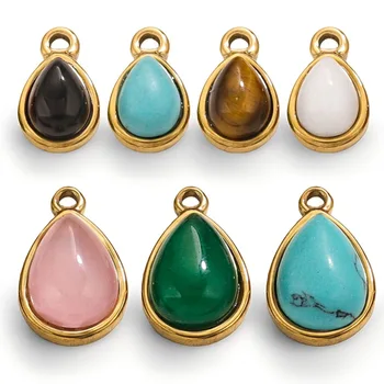 Tear Drop Natural Stone Pendants PVD Gold Stainless Steel Charm: Turquoise Onyx Rose Quartz for Necklace Bracelet Earring Making
