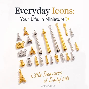 Everyday Icons Charms | 18K PVD Gold Plated Stainless Steel Mini Object Pendants for Jewelry Making | Waterproof, Hypoallergenic