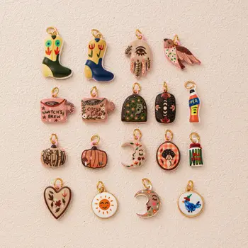 Autumn Folk Magic | 18K Gold Plated Brass Hand Painted Enamel Effect Charms for DIY Jewelry Making | Whimsical Celestial Pendant