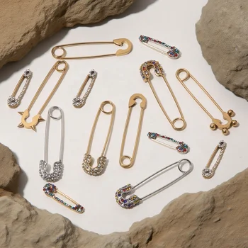 Pave Safety Pin Brooch | 18K PVD Gold Plated Stainless Steel Decorative Pin for DIY Jewelry, Brooch Styling & Waistband Cinching