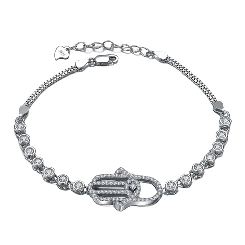 925 Sterling Silver Bracelets Pave Clear Zircon Hamsa Hand Box Chain Silver Woman's Bangle Bracelet